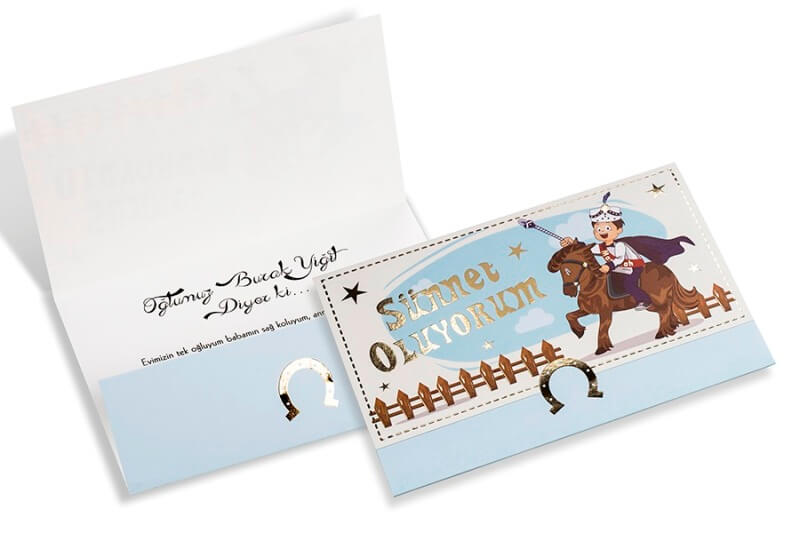‘Sünnet Oluyorum’ baskı ön yüzünde ata binmiş sünnet çocuğu imajı ile şirin sünnet davetiyesi modeli.