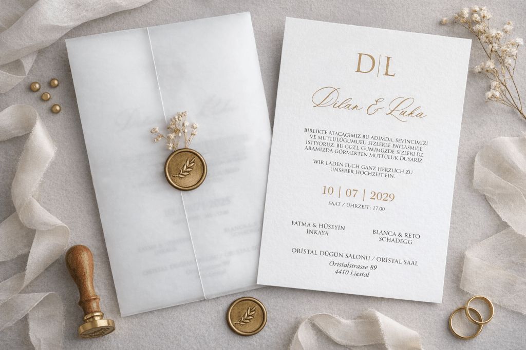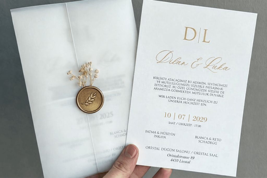 Yarı şeffaf aydıngerden imal edilmiş açık zarf, çift renk baskılı iç kart ve üzerinde kuru çiçek ve mühür aksesuarı bulunan beğenilen mühürlü davetiye örneklerinden.