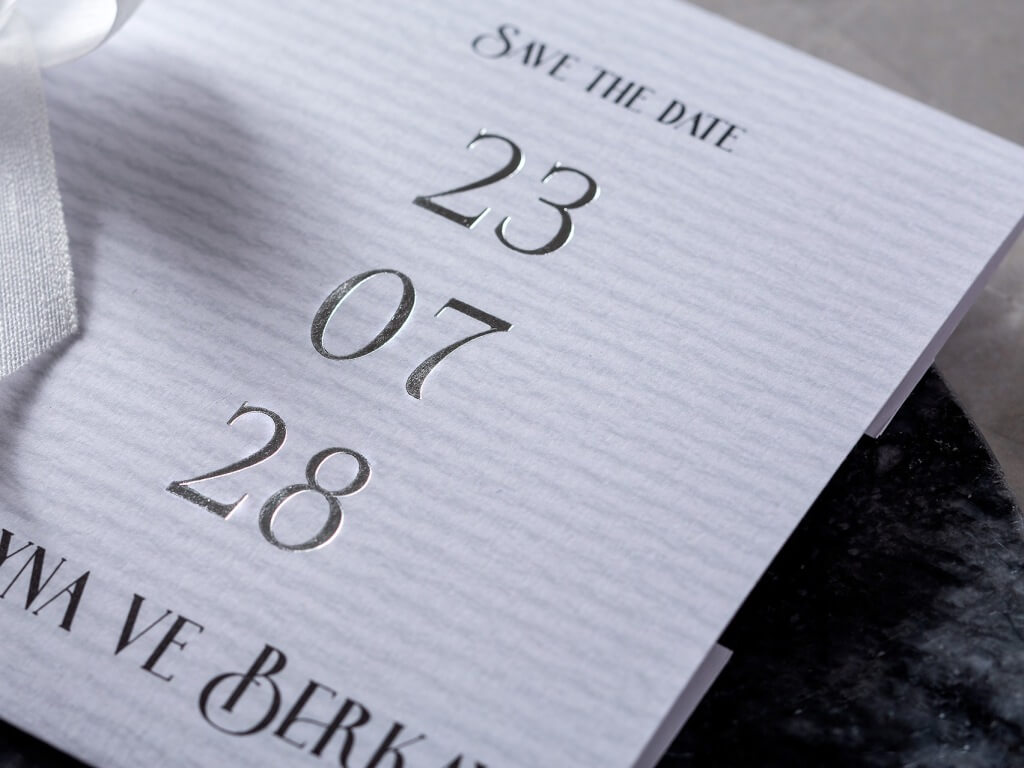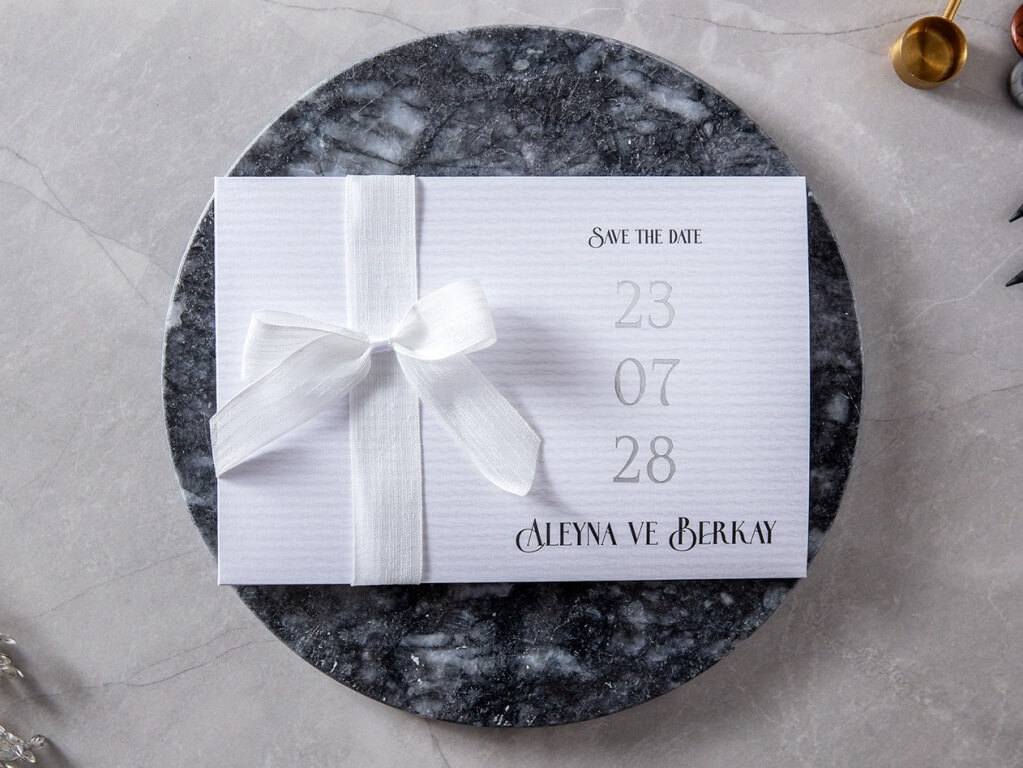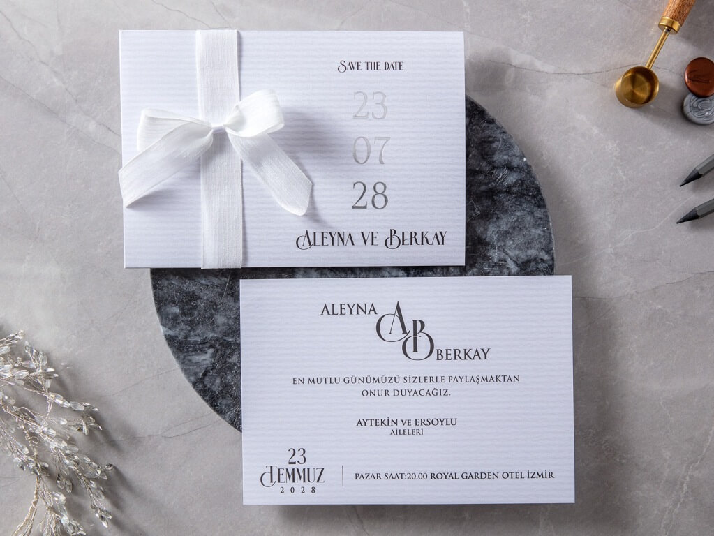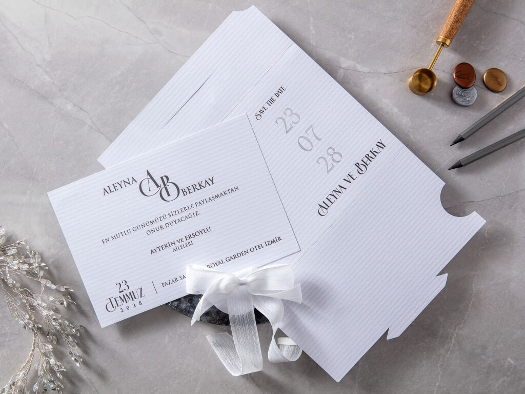 Yatay gri çizgilere sahip beyaz zarf ve iç karta sahip, fiyonk aksesuarlı şık tasarıma sahip sade davetiye modeli.