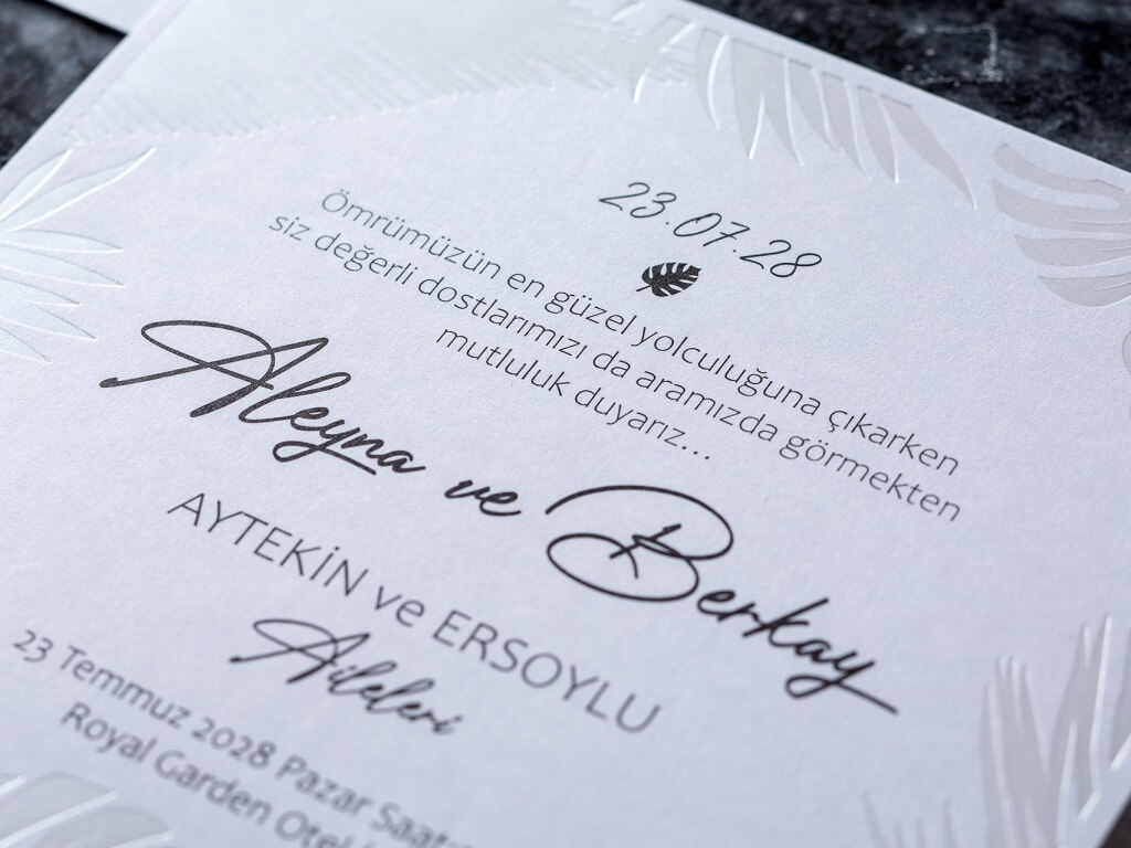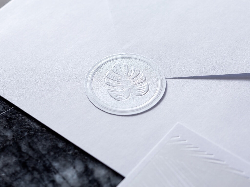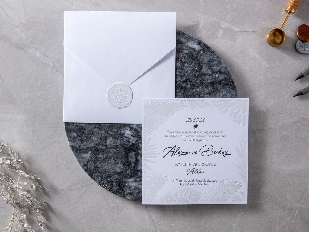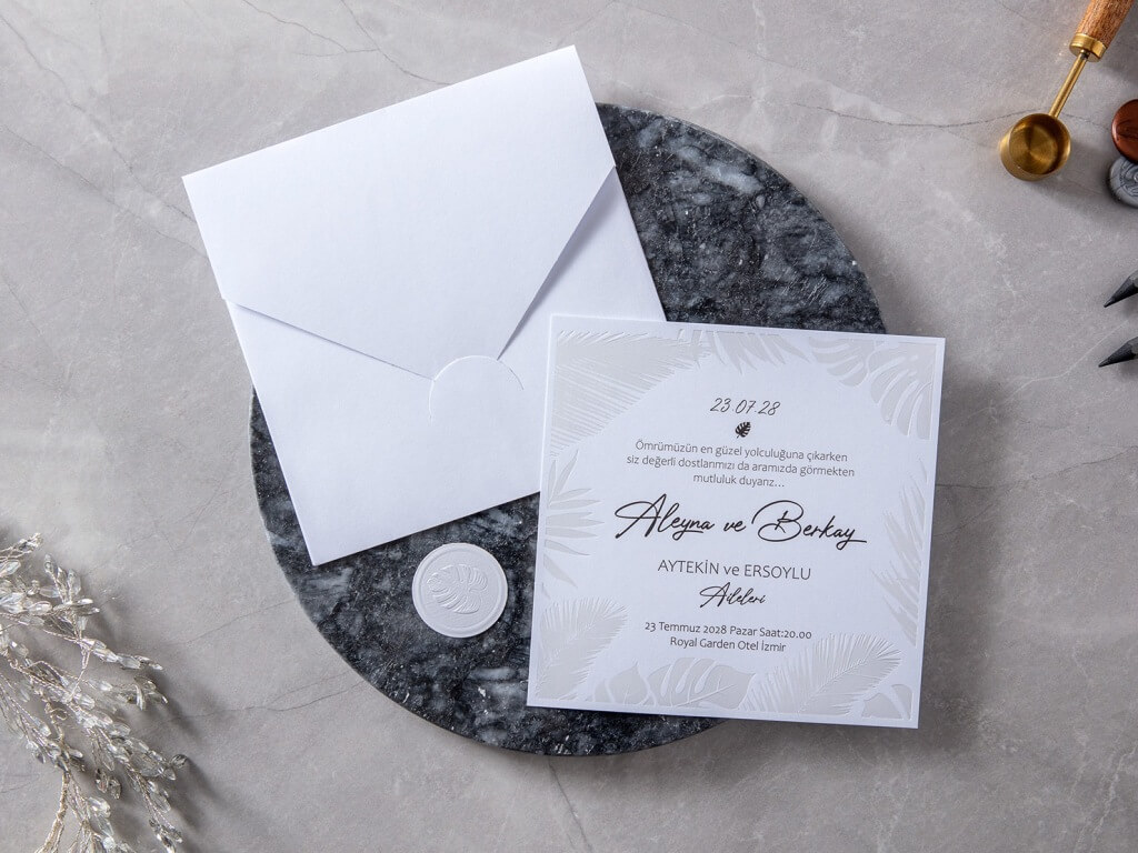 Kare Beyaz zarfı üzerinde yaprak motifi bulunan mühür şeklindeki etiketli, sade ve şık dizaynlı, beyaz etiket mühürlü davetiye modeli.