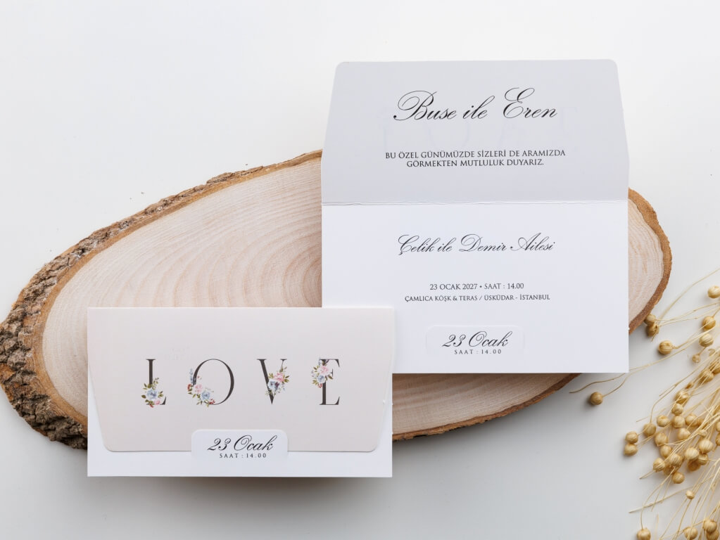 Üzerinde çiçekler ile yazılmış LOVE yazısı bulunan,, zarfsız kullanılan çiçek temalı ekonomik davetiye modeli.