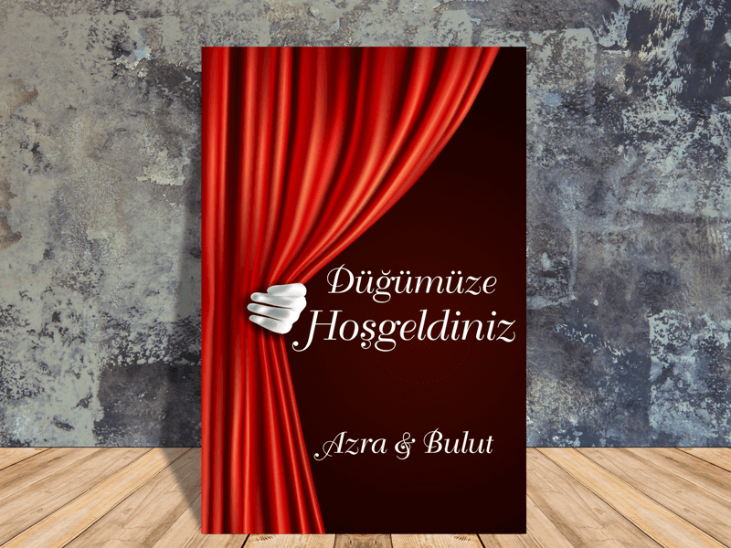 Açılan sinema perdesi şeklindeki farklı tasarımı ile sıradanın dışına çıkmak isteyen gelin damat adayları için, perde karşılama panosu modeli.