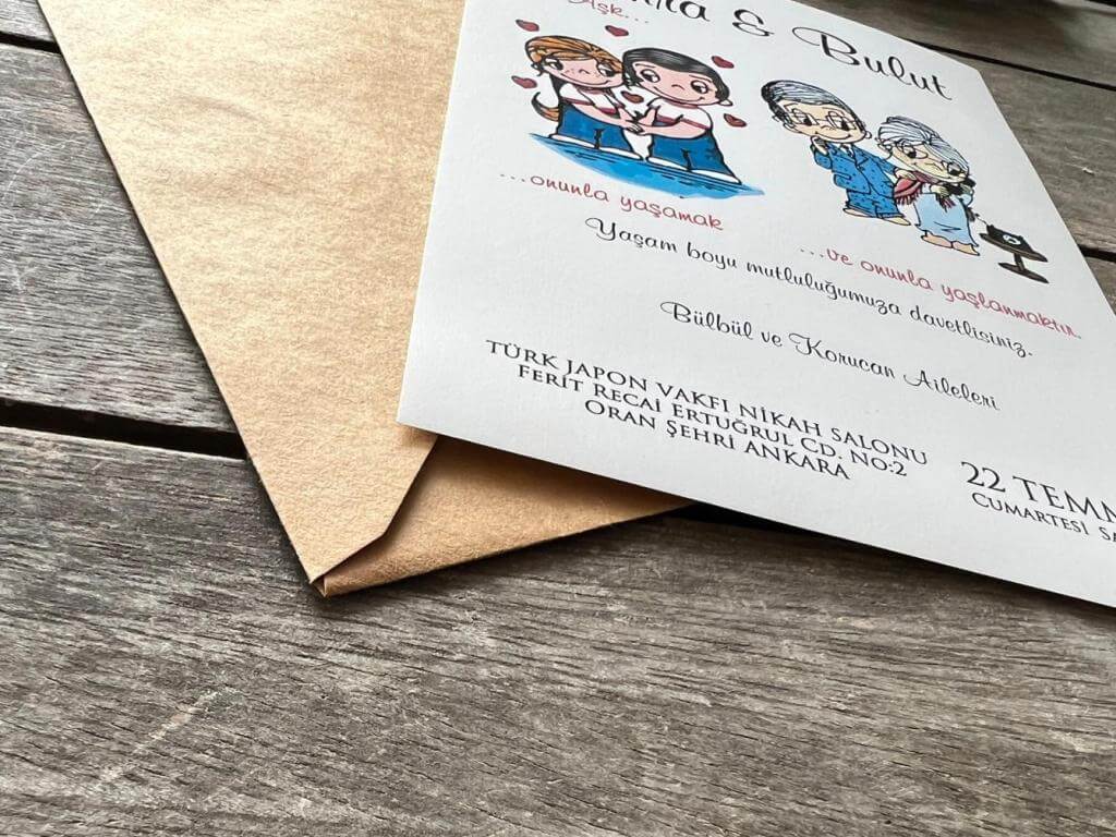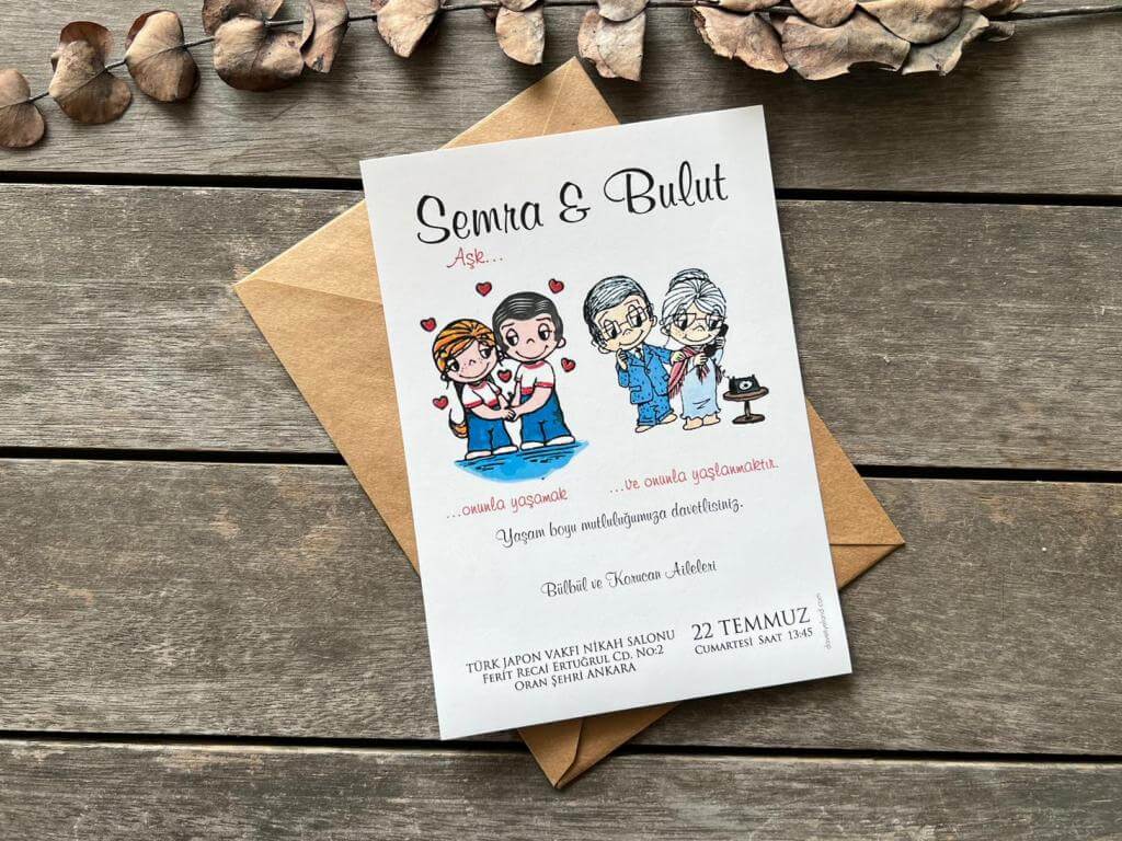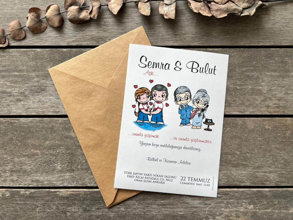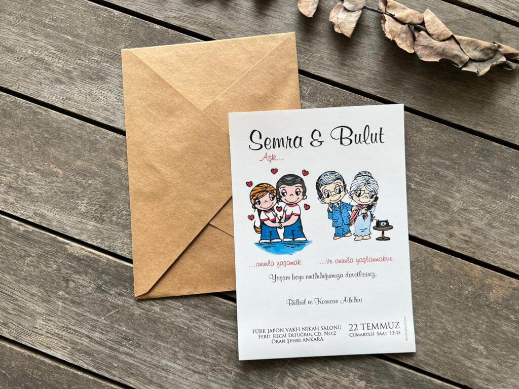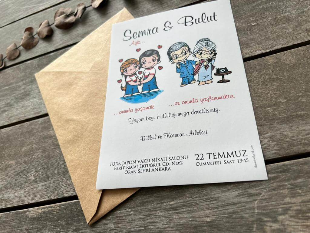 Gençlik ve yaşlılık hallerinin karikatürize edildiği , “Aşk… onunla olmak ve onunla yaşlanmaktır” sloganı ile anlamlı ve bir o kadarda şirin davetiye modellerinden. İlginç ürünler arayan çiftlerimize özel farklı tasarımı ile beğenilen şıp sevdili davetiye modeli.
