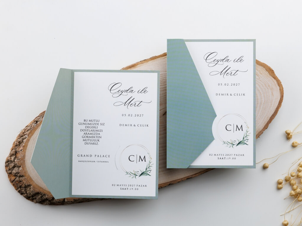 Yeşil tonlarında üçgen kapaklı, iç baskılı kısmında üzerine yaprak çelengi figürü bulunan ekonomik fiyat aralığındaki renkli davetiye modeli.